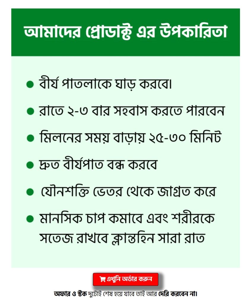 এটি নিয়মিত খেলে আপনার সহবাসের সময় ২৫ - ৩০ মিনিট বৃদ্ধি পাবে।